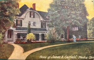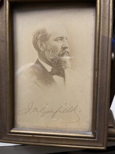 For years I’ve been collecting political memorabilia, including a few Garfield items. The Netflix series “Death by Lightning” has inspired me to revisit the four Garfield memorial biographies I’d forgotten I had in a bookcase devoted to presidents, as well as to unearth a glass Garfield memorial dish.  This treasure gives the dates of his birth and death with the words “We Mourn Our Nation’s Loss.”