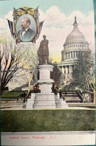 Much Lincoln memorial material appeared in the immediate aftermath of his assassination on April 14, 1865.  Unlike Lincoln who sought the presidency,  Garfield didn’t want the job.  A Civil War general, lawyer and nine-term Ohio congressman, he reluctantly allowed himself to be nominated and won on the 36th ballot of the 1880 Republican National Convention in Chicago. The candidate then narrowly defeated Democrat William S. Hancock in November. Garfield proposed civil service reforms to eliminate political appointments.  But fate intervened when he was shot by the delusional job-seeker Charles Guiteau at the Baltimore & Potomac Railroad Station where the National Gallery now stands.