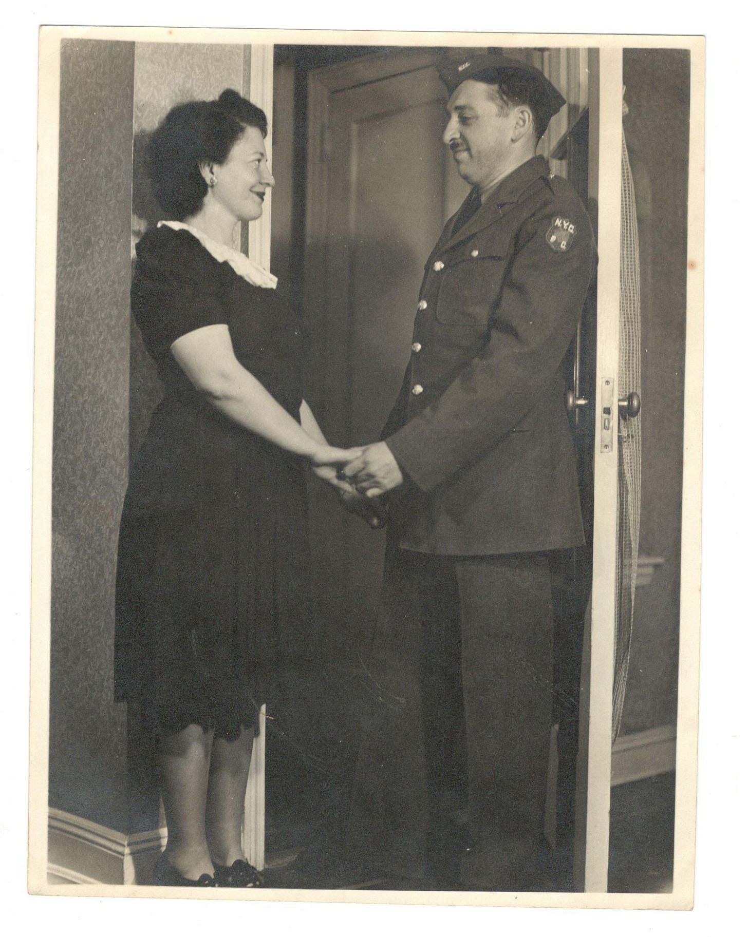 My father, Gerard Previn Meyer, registered for the draft but was not initially called up. My parents almost named me “Justin,” because I was born just in time to keep him, a married man with a child, at home. But then, motivated by his own sense of patriotism, he volunteered for the New York City Patrol Corps, known as “LaGuardia’s Army,” to guard the home front, including the nearby airport. Below is a photograph, very likely taken inside the Jackson Heights, Queens apartment, of my dad in his uniform, my mother gazing lovingly and proudly at him. She balked at pistol training, ending my dad’s service. But he felt self conscious on the subway when he heard others in uniform ask what was his unit. He then sought a military commission, citing German as his “ancestral language,” but burying the lede below a recitation of his many academic honors in English and French literature.